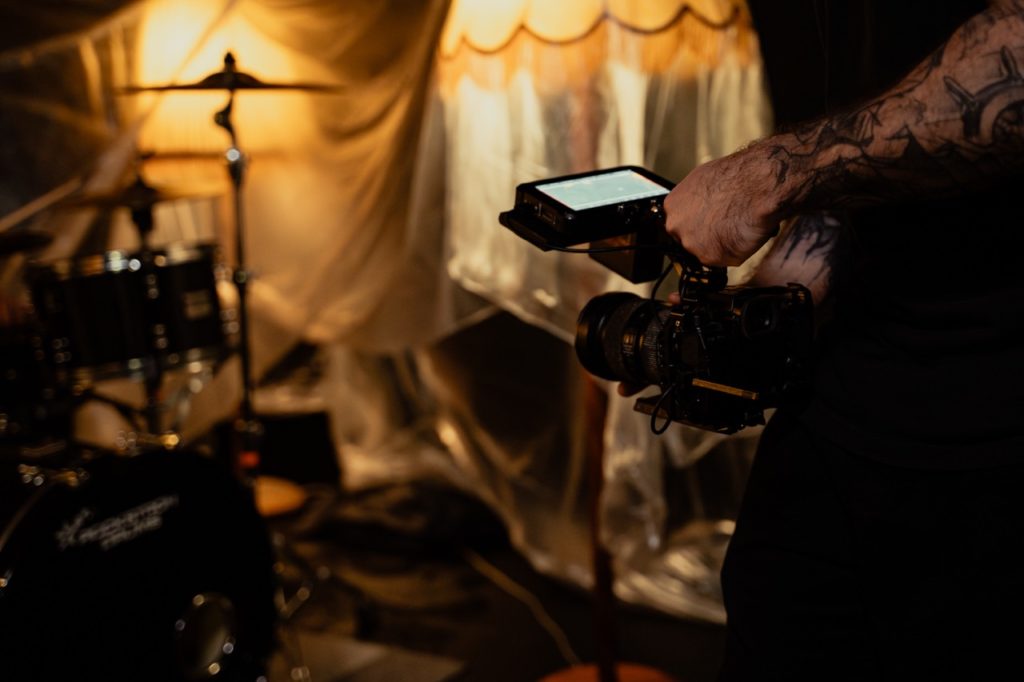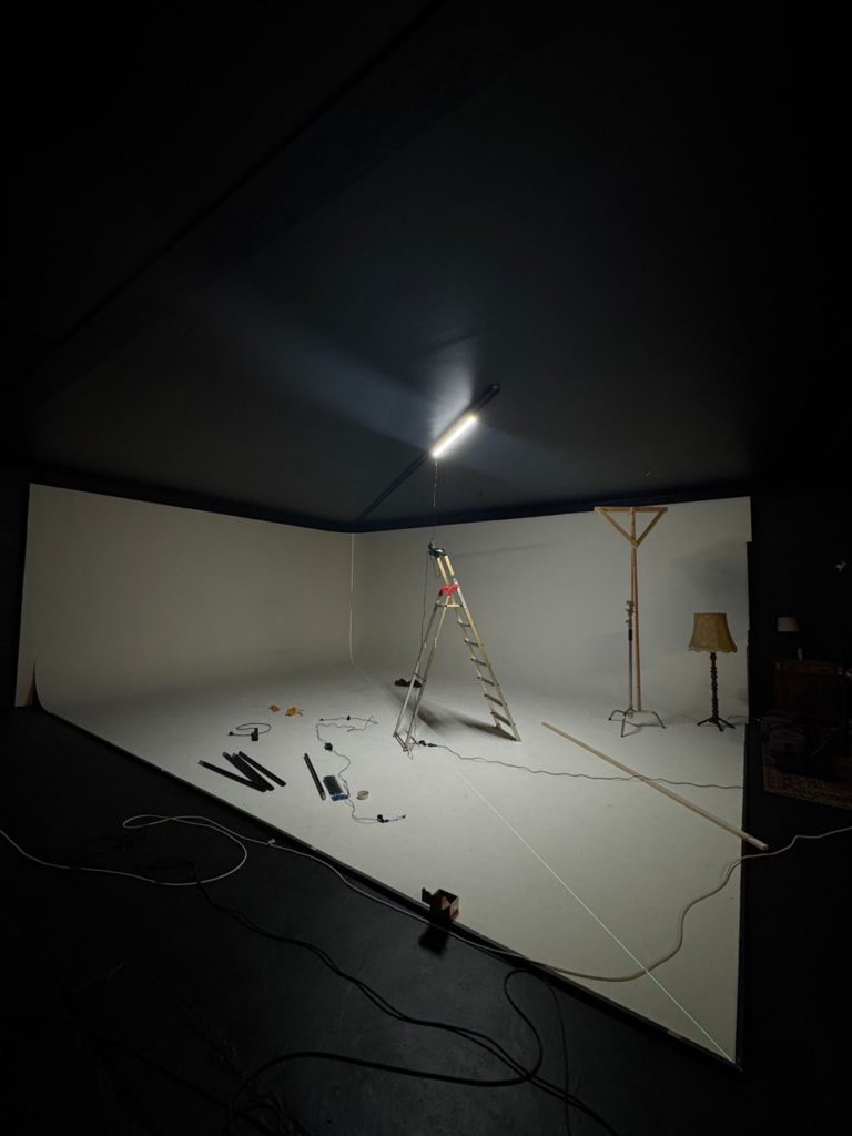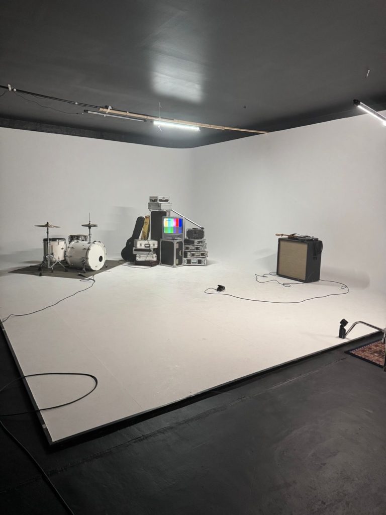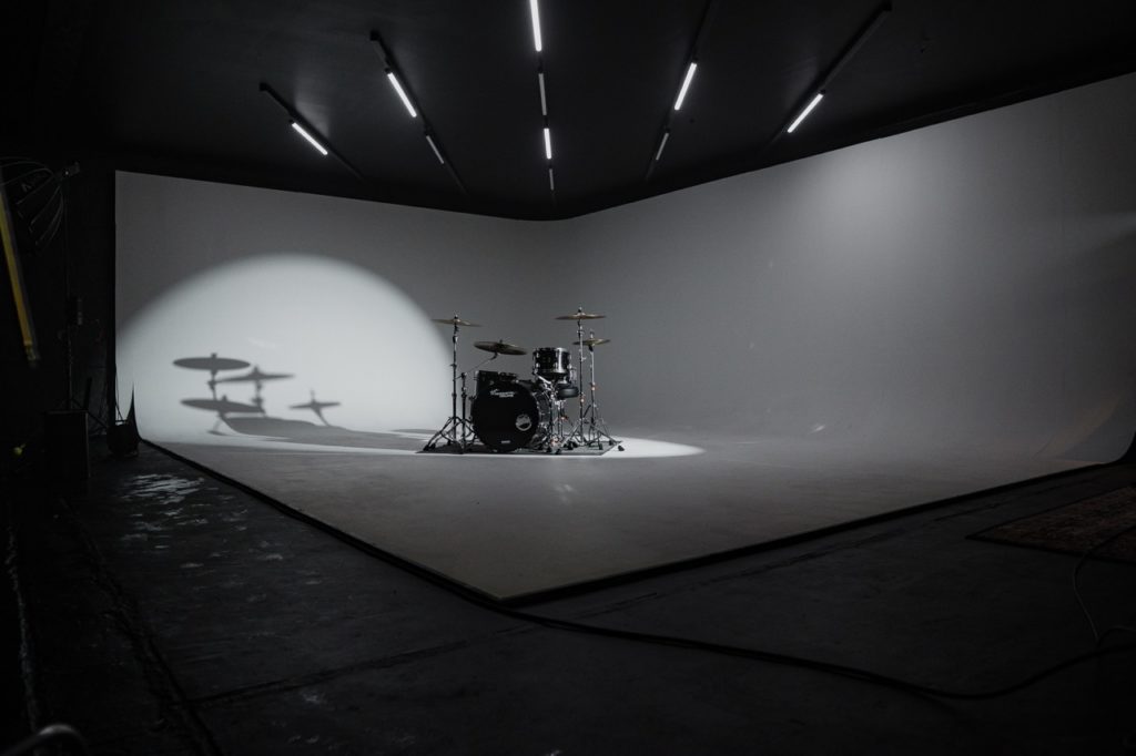 Unsere Hohlkehle (Cycwall) mit ihren großzügigen Maßen von 6 × 8 Metern und einer Höhe von 3,5 Metern bietet vielfältige Nutzungsmöglichkeiten – von Einzelportraits bis hin zu kompletten Bands.