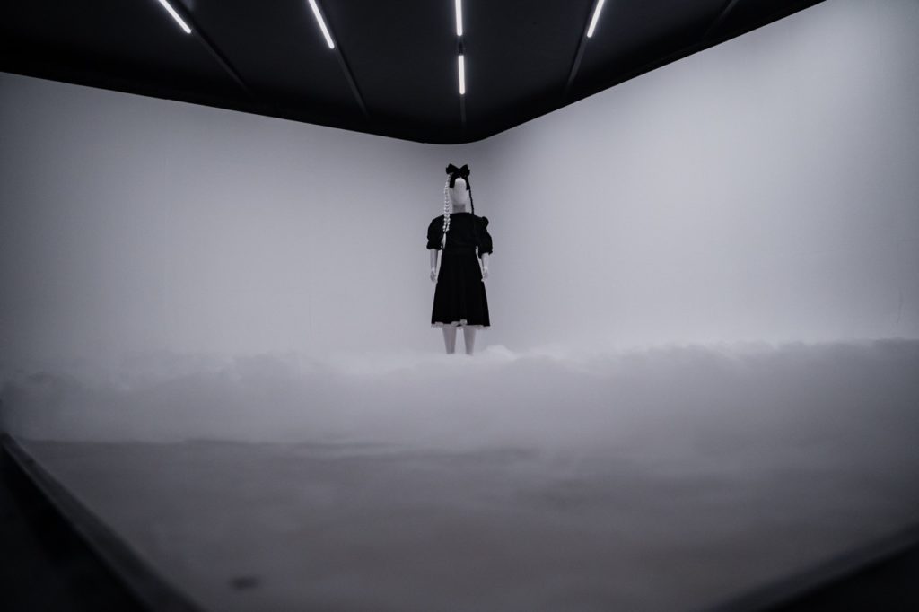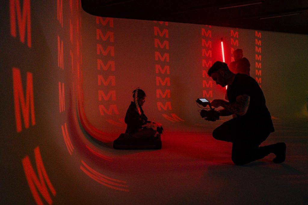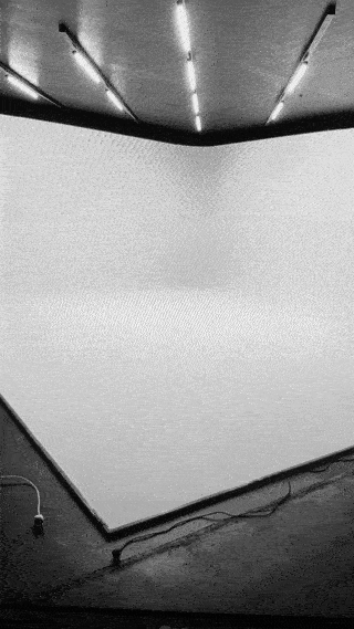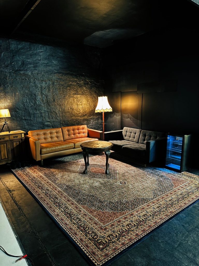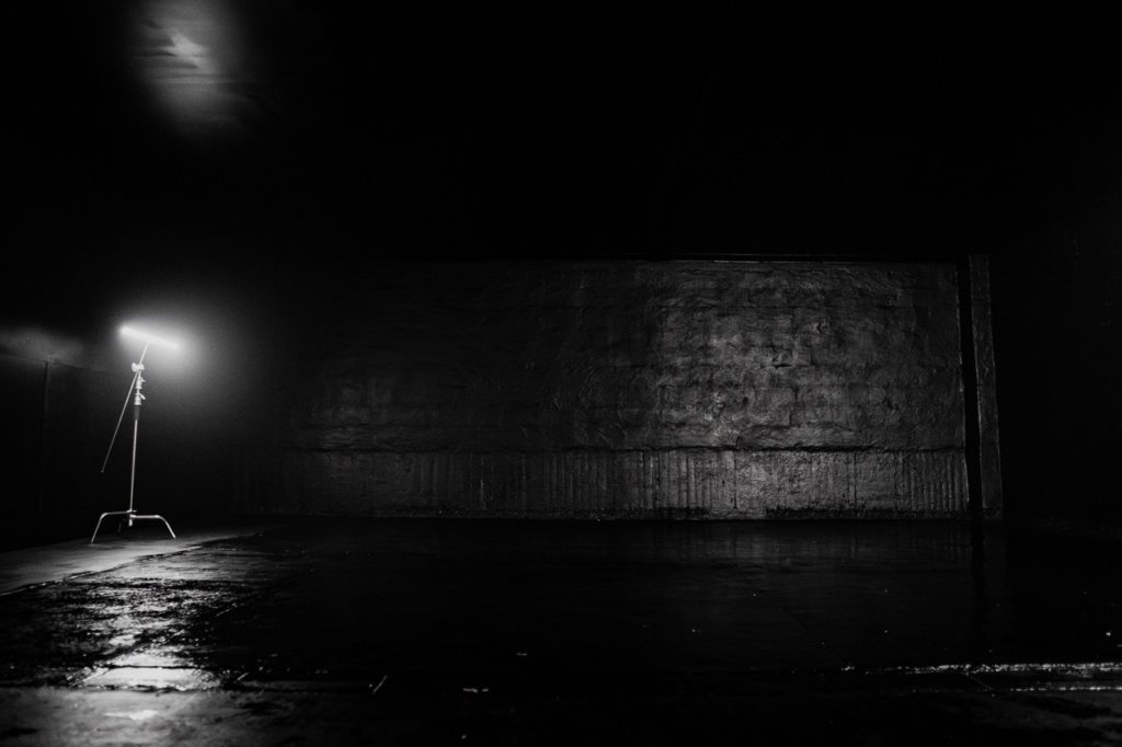 Tiefschwarz präsentiert sich unser 8,5 × 8 Meter großer Raum, der je nach Wunsch individuell ausgeleuchtet werden kann. Ob vollständig in dunkler, endloser Schwärze oder mit einer schimmernden Wand im Industrial-Look – beide Stimmungen lassen sich flexibel erzeugen.