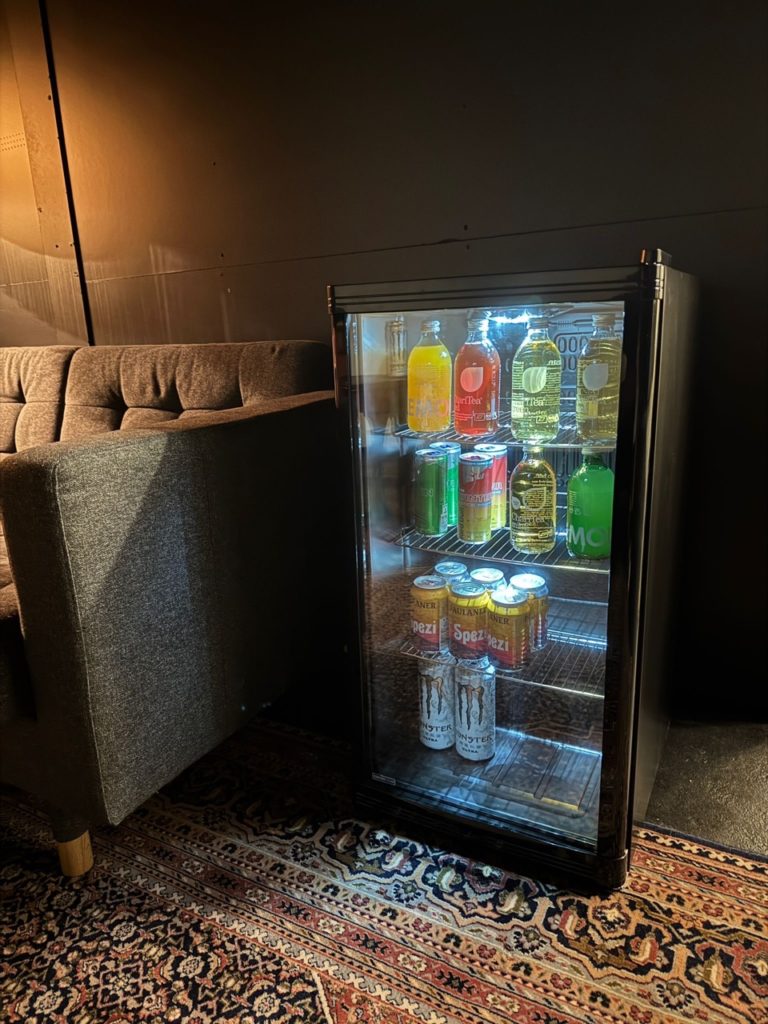 Direkt an die beiden Studios grenzt unser Loungebereich, in dem ihr euch aufhalten und entspannen könnt. Dort steht euch ein gefüllter Getränkekühlschrank zur Verfügung – ideal für Pausen zwischen den Sets.